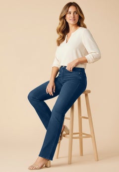 Our pull-on plus size bootcut jeans include a wide waistband that provides you with reliable coverage that lasts. Throw on some booties for a day-to-day ensemble or match them with cowboy boots for a fun night-out outfit.