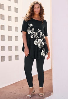 Get glammed up in our Faux Leather Front Ponte Leggings by ellos®. We love mixing materials like leather with light and airy materials like chiffon. Our Sheer Lurex Patterned Tunic by ellos® is a stunning pairing. This beautiful duo is chic and modern, and you can dress it up with heels if you prefer.