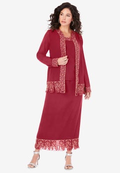 We also carry sparkling plus size jacket dresses. They include bust darts that add a flattering shape and a jacket that effortlessly falls in waves. And if you’re leaning toward modern formal wear, stay on-trend at your next celebration with our lace sets that boast mesmerizing jeweled closures.