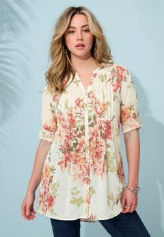 When we go big, we go really big! With over 700 plus size long sleeve shirts and blouses designed for sizes S to 6X (12-44), there’s a style for everyone. You could buy and wear a new shirt everyday for nearly two years! Shop knit or woven fabrics, embellished with lace, eyelet, fringe or pleating. Pick prints that are lively: think basic plaids, stripes or polka dots and trendy florals or abstracts. From a simple button-down to a dressy tunic, our plus size long sleeve shirts and blouses will take you stylish places you never imagined!
