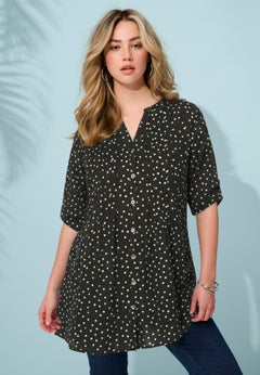 When we go big, we go really big! With over 700 plus size long sleeve shirts and blouses designed for sizes S to 6X (12-44), there’s a style for everyone. You could buy and wear a new shirt everyday for nearly two years! Shop knit or woven fabrics, embellished with lace, eyelet, fringe or pleating. Pick prints that are lively: think basic plaids, stripes or polka dots and trendy florals or abstracts. From a simple button-down to a dressy tunic, our plus size long sleeve shirts and blouses will take you stylish places you never imagined!