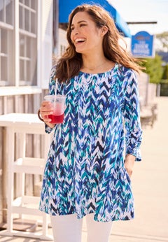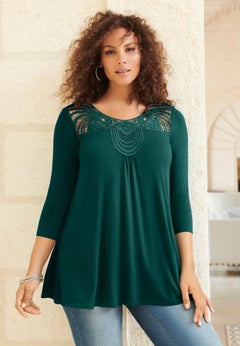 Looking for fashionable plus size tops or tees where sleeves can never be too long? We’ve got the perfect solution – ¾ sleeve plus size tops and tees! Never again find sleeves floundering in your food or work! These plus size tops and tees sized S to 7X and 12 through 48 fit your curves. Shop basic, embellished, printed or patterned tunics, popovers or button-front styles in woven cotton or knit blends. Designed by the most plus size brands available in one place. Shop the ¾ sleeve styles you love and stay top tier!
