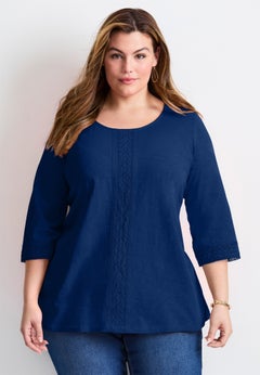Looking for fashionable plus size tops or tees where sleeves can never be too long? We’ve got the perfect solution – ¾ sleeve plus size tops and tees! Never again find sleeves floundering in your food or work! These plus size tops and tees sized S to 7X and 12 through 48 fit your curves. Shop basic, embellished, printed or patterned tunics, popovers or button-front styles in woven cotton or knit blends. Designed by the most plus size brands available in one place. Shop the ¾ sleeve styles you love and stay top tier!