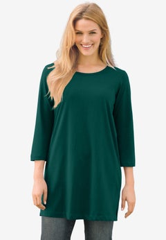 Looking for fashionable plus size tops or tees where sleeves can never be too long? We’ve got the perfect solution – ¾ sleeve plus size tops and tees! Never again find sleeves floundering in your food or work! These plus size tops and tees sized S to 7X and 12 through 48 fit your curves. Shop basic, embellished, printed or patterned tunics, popovers or button-front styles in woven cotton or knit blends. Designed by the most plus size brands available in one place. Shop the ¾ sleeve styles you love and stay top tier!