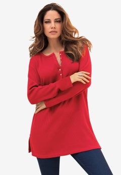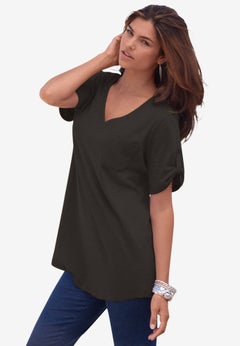 If long-lasting comfort is your number-one priority, we suggest browsing our plaid tunics. They feature a modern dip dye design and cool-to-the-touch material that skims your shape without clinging to your body throughout the day. Plus, you can slip one of these plus size sleeveless T-shirts under a jean jacket or keep them unbuttoned over a tee. Also, with their alluring bateau neckline, our relaxed travel knits are a movement-friendly essential for your next getaway.