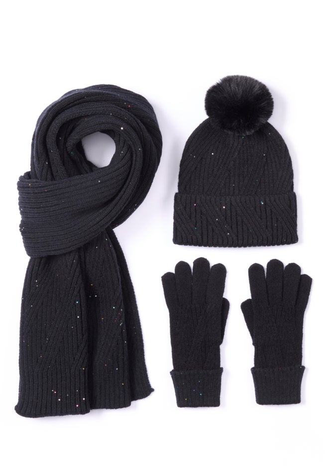 3-Pc Sequin Knitted Hat, Scarf And Gloves Set