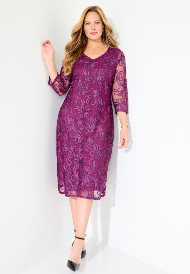 Detailed embroidery adds eye-catching artistry to this flowing special occasion midi dress. A flattering V-neckline and a timeless silhouette make this style an instant classic.