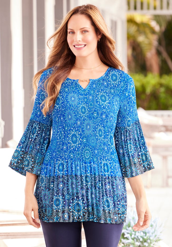 FIT: Relaxed, yet refined. Soft, forgiving pleats float over your curves for ultimate comfort. Keyhole neckline with chain detail. 3/4 angel sleeves. Tunic length.
