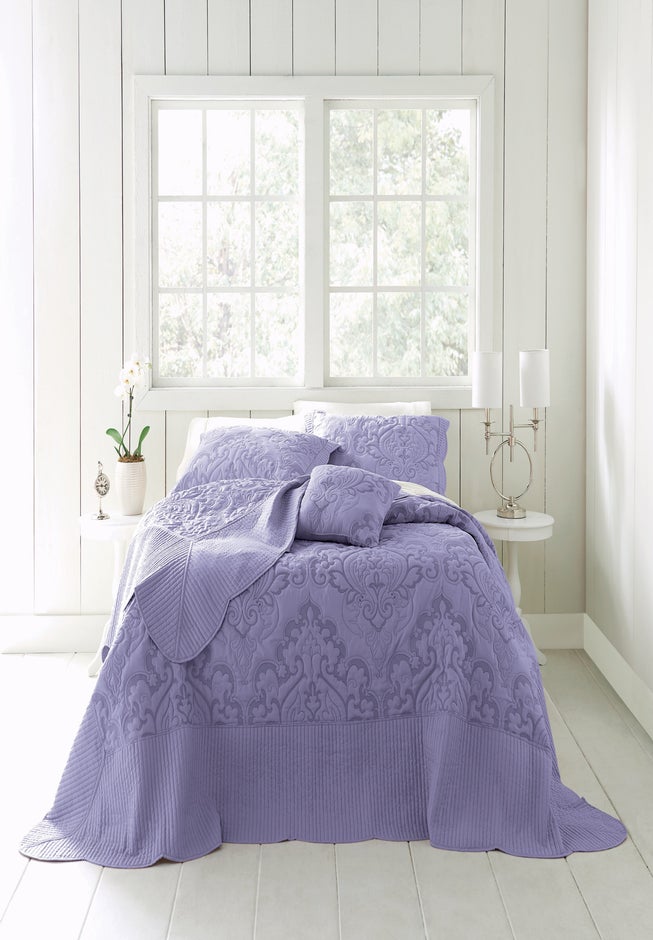 The Amelia bedspread features meticulous allover embroidery in a damask motif, giving it an elegant and decorative appearance. This embroidery adds a touch of sophistication to the bedding. The bedspread is quilted with a scalloped border, which not only adds to its visual appeal but also contributes to its graceful drape when placed on the bed.