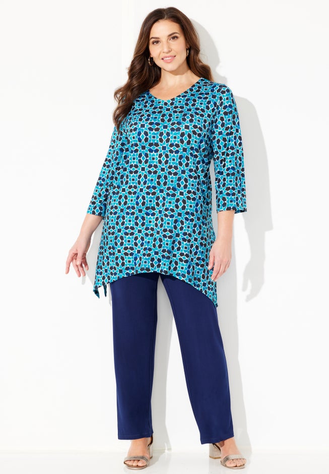 Add a little wow to your AnyWear wardrobe with this fluid V-neck tunic with flattering two-point hem and dramatic side slits.