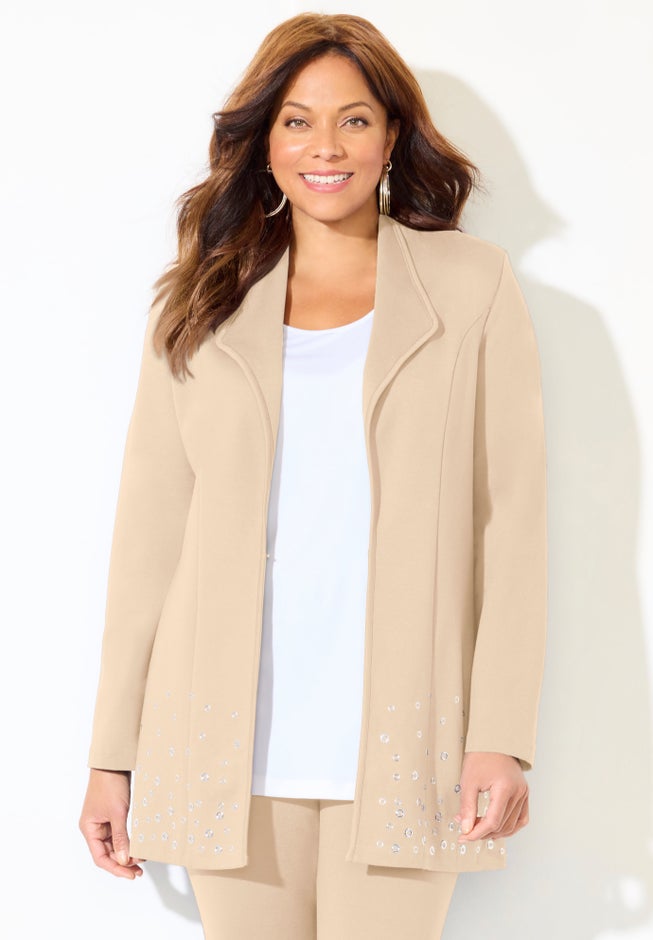 Part of our Black Label exclusive collection of premium, limited edition styles with a focus on fashion and quality. Once you try this jacket on you’ll notice how it elongates the body and flatters it with a slimming effect. You’ll feel how soft and smooth the Ponte fabric is and notice how much support it gives to the jacket’s shape. If you’re like us, you’ll appreciate how it drapes the body beautifully without clinging. It’s styled with leather-like binding along the edges and shiny silver grommets at the hem. It really is simply stunning.