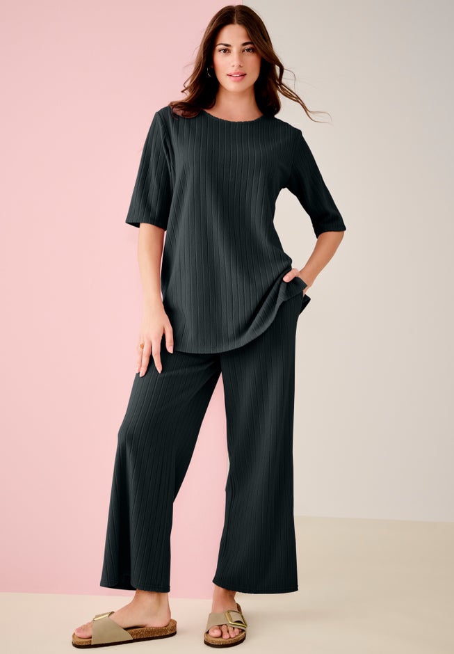 This cozy two-piece set features a ribbed knit crewneck top and matching cropped wide-leg pants for head-to-toe comfort. Thoughtful details like patch pockets, side slits, and a flat waistband keep the fit easy and elevated. Style as a full set or mix and match with denim or your favorite tees for endless love-to-lounge options.