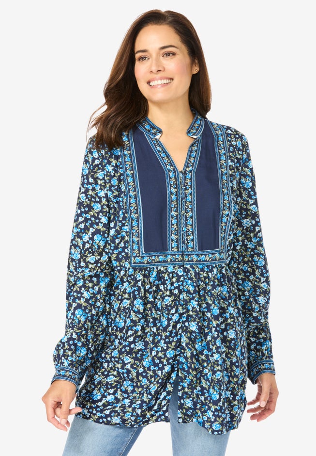 The perfect mix of feminine details and laid-back ease. This pretty tunic comes in gorgeous prints with a contrasting bib. Shirring at the waist and slight blouson sleeves add even more pretty details. Designed with covered buttons with a loop closure that blend seamlessly into the top.