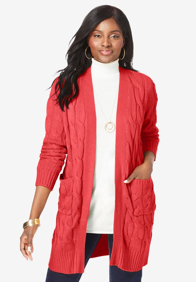 This classic sweater duster is a must-have for fall-forward style. The cable knit detailing adds a soft, textural touch while the shawl collar lends eye-catching appeal. The relaxed fit is figure flattering and effortlessly pairs over everything in your wardrobe.