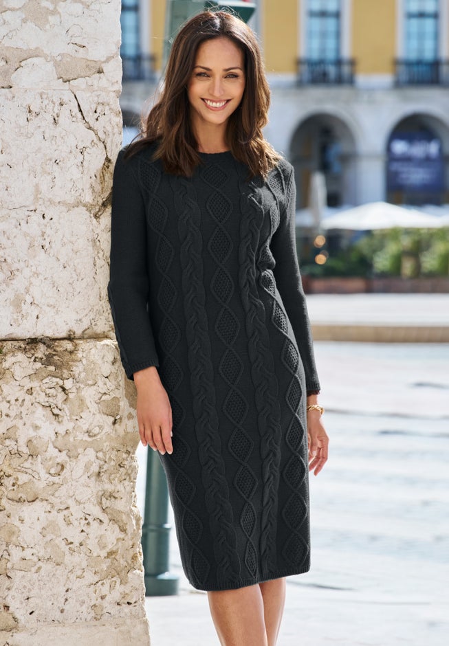 This simple yet sophisticated sweater dress makes transitioning into the colder seasons look easy. Designed in a comfy cable knit, this impeccably tailored silhouette incorporates key seasonal trends with classic, elegant style into a one-and-done outfit that loves your curves. Pair with riding boots or block-heeled booties for a fabulous fall-forward look that always works.