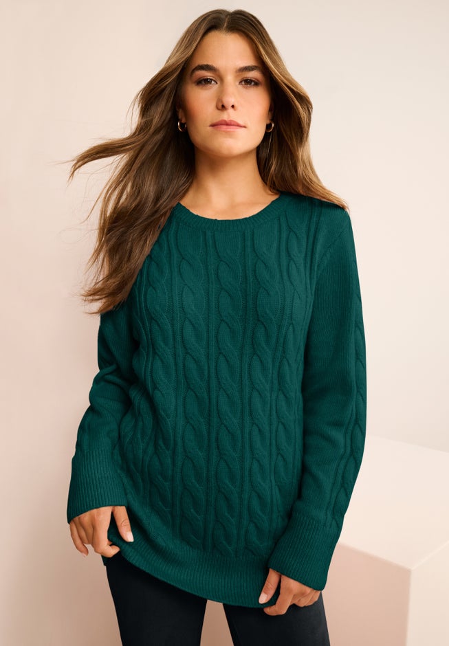 The classic cable sweater gets a refresh with variegated cable stitching and a relaxed fit that flatters every curve. The soft crewneck and subtle drop shoulder create an easy, casual look you'll reach for again and again with jeans or a midi skirt.