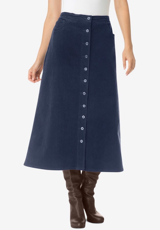 This plus size corduroy skirt can be be paired with your favorite tops and sweaters. With great details such as slant pockets and a supremely comfortable side elastic waist, you will be comfortable all day long.