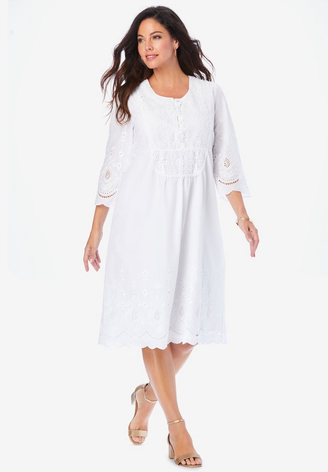Your new weekend popover dress has arrived–crafted from soft cotton and featuring delicate eyelet details at the front. With charming novelty pearl buttons and scalloped cuffs, this effortlessly feminine style is perfect for brunch, a weekend getaway, or casual Fridays. Scoop neckline. Bell sleeves. Fully lined with a side zipper.
