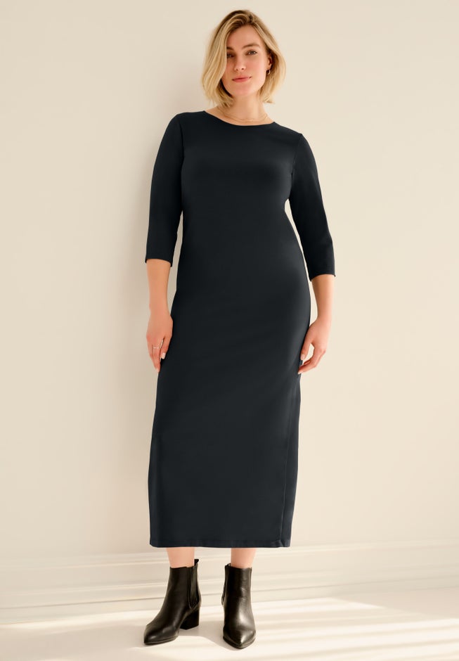 Cotton Spandex Crew Neck 3/4 Sleeve Maxi Dress