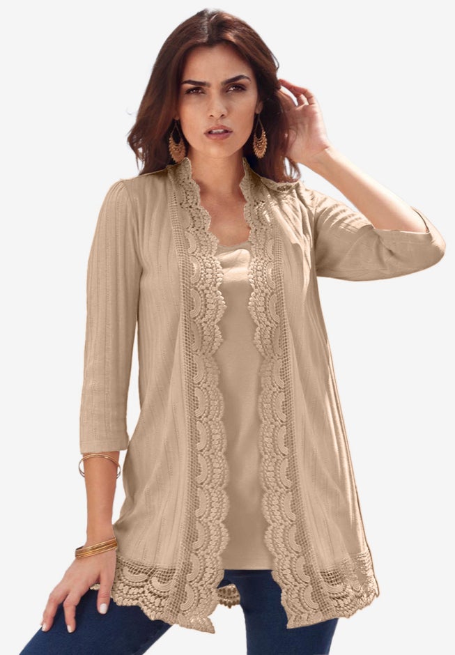 Soft, feminine and the perfect layer, this lovely piece is easy to wear over any look. Three-quarter length sleeves, open front, and a relaxed silhouette.