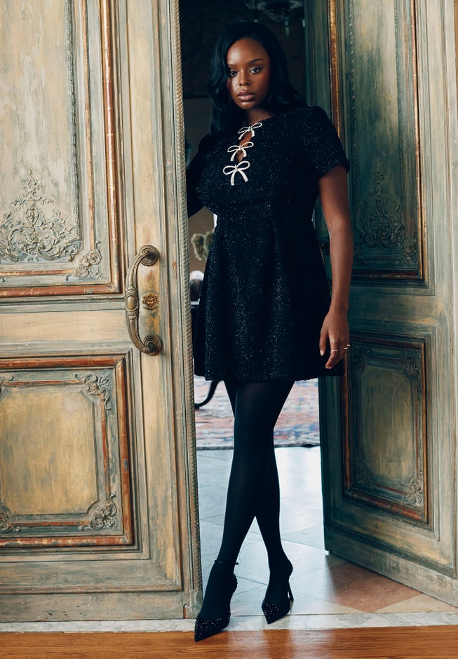 This tweed mini dress brings all the charm—thanks especially to crystal-bow details & a chic back cutout. Fully lined and cut with short sleeves, it’s a modern nod to classic Parisian style. Pair yours with sheer tights & just-as-sparkly jewels.