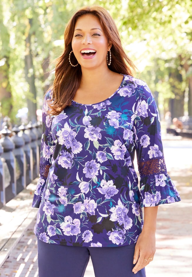 A soft, beautiful top for dressing up and going out, or anytime you want to add a little edge. Designed from a sleek, stretchy fabric that elevates your look. Finished with beautiful bell sleeves with crochet trim.