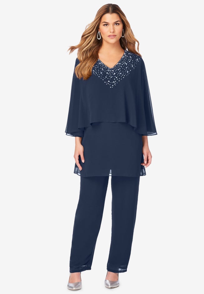 Comfort meets glam in this dressed-up look. Sleeveless rhinestone- and sequin embellished V-neck tank with sheer elbow-length overlay. Pull-on elasticized straight-leg bottoms. This is our favorite way to effortlessly wear pants for the evening.