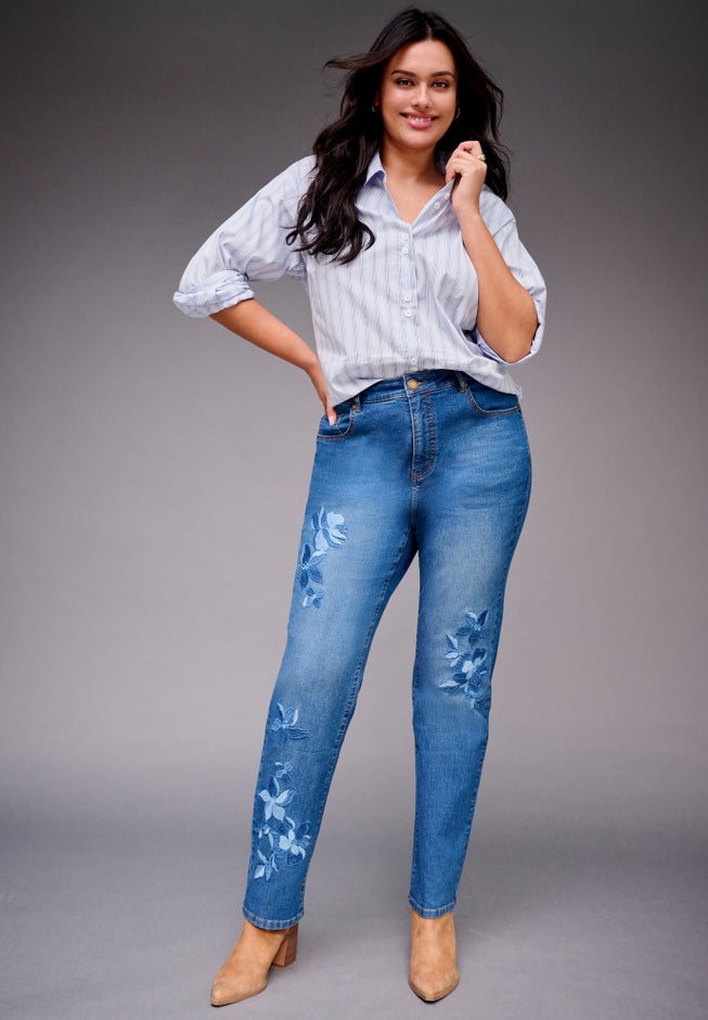 A fresh take on a classic, these jeans feature delicate floral embroidery that adds a feminine touch to the timeless design. The straight-leg silhouette offers a flattering, versatile fit that pairs effortlessly with any top. Dress them up with heels or keep it casual with sneakers for an easy, everyday look.