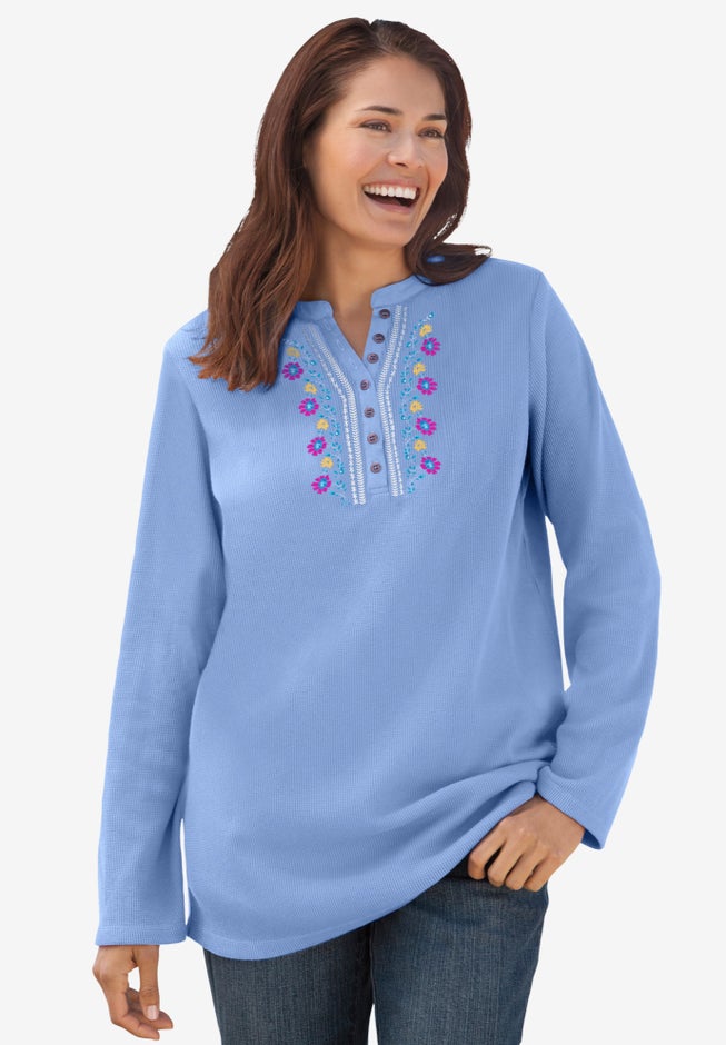 This comfortable thermal is lightweight and is perfect for all year around. This softly textured waffle knit fabric is sure to keep you comfortable. V-neck Henley front with metallic buttons and floral embroidery for a stunning effect. Soft and snuggly, this feminine style will feel good every time you put it on.