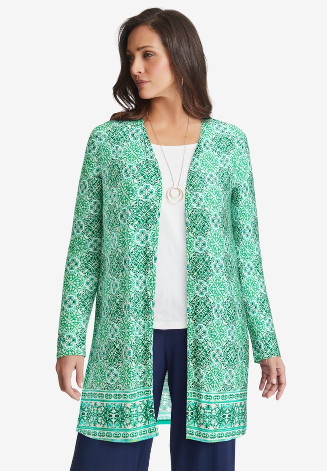 Tailored, long sleeve, knit cardigan with open front. Side slits.