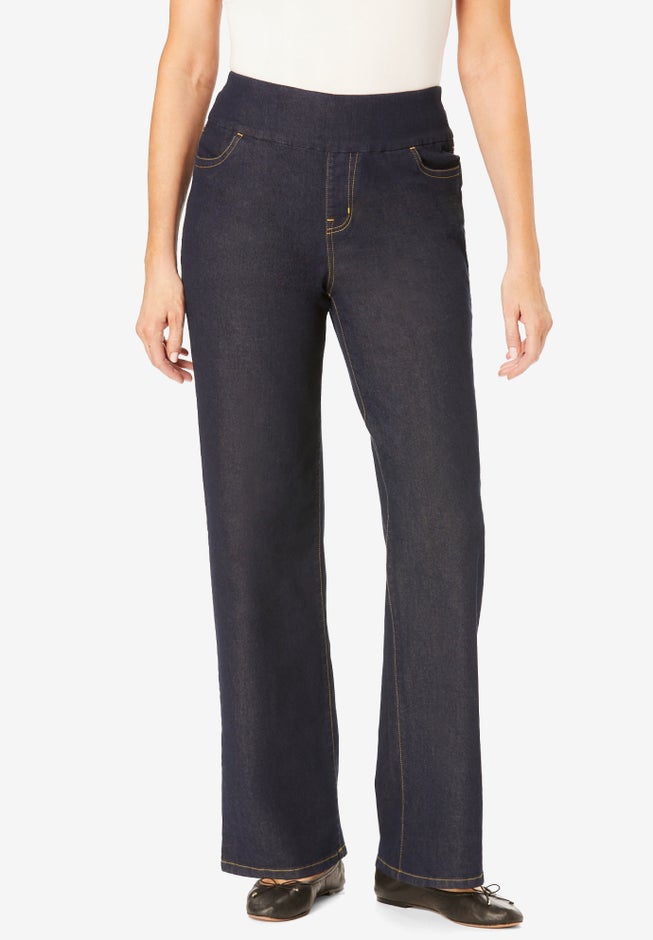 This easy, wide-leg denim jean is designed with a full flat-elastic. A no-gap waistband that lays flat against the body to provide a smooth look under all your favorite tops and tunics. Enjoy the classic look of a great pair of jeans but move comfortably thanks to allover stretch.