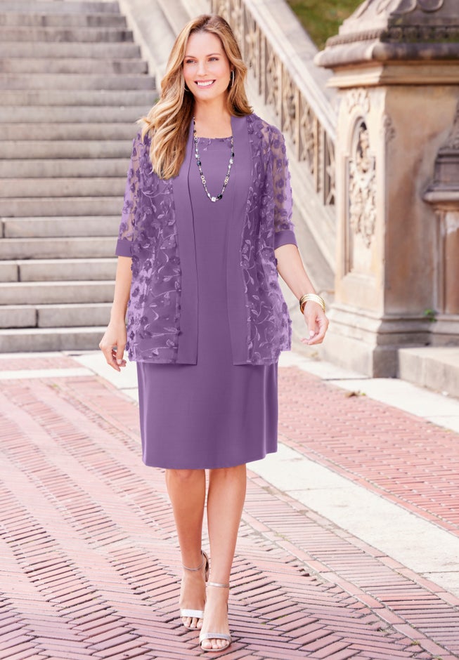When the occasion calls for an effortless elegance, this style is it. It gives the illusion of a dress chicly layered with a flowing jacket. The jacket’s crafted from a lightweight mesh designed with delicate floral embroidery and contrast binding that accentuates the silhouette beautifully. Try it on. Notice how it drapes the body with an easy grace.