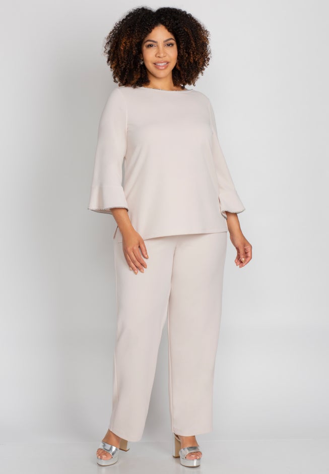 With a touch of sparkle, this sleek two-piece pant suit blends refined tailoring with subtle shine. The boatneck top features flounce sleeves trimmed with shimmering detail for understated elegance. Paired with matching pull-on pants that pulls on effortlessly and drapes beautifully, creating a comfortable yet elevated look.