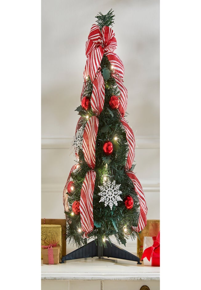 This lovely pre-decorated, pre-lit pop-up tree is great for small spaces and features 30 warm white LED lights. Timer functions 6 hrs. on/18 hrs. off. Includes French ribbons, bows & ornaments.
