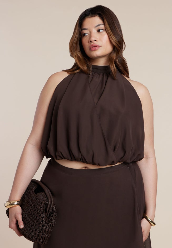 Introduce gentle volume with this high neck bubble top shaped by a cropped silhouette and gathered hem. Adjustable ties define the open back, while soft shirring creates dimensional shape through the body.