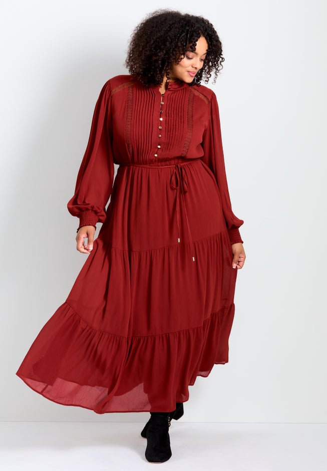 Add a dreamy style your wardrobe with the Jasmine Maxi Dress! Perfect for memorable occasions, this dress flaunts a tiered skirt, full length sleeves and a waist tie belt with gold hardware!