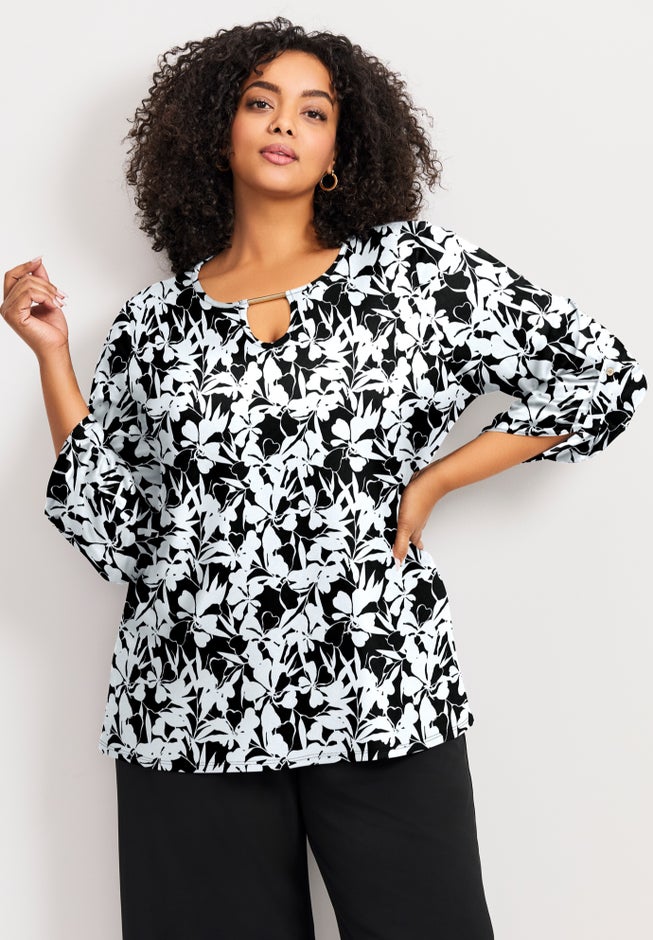 FIT: Relaxed fit. Keyhole neckline with chain detail. 3/4 length sleeves with button tab.