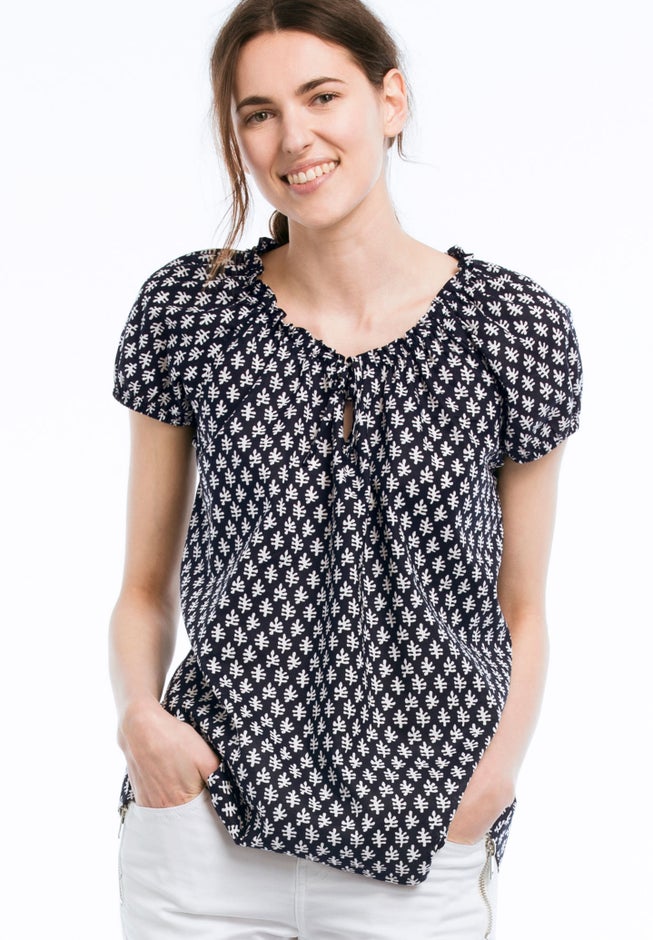 Peasant blouse in an A-line silhouette. Gathered scoop neckline with keyhole and drawstring. Elasticized raglan cap sleeves. Slightly curved bottom hem.