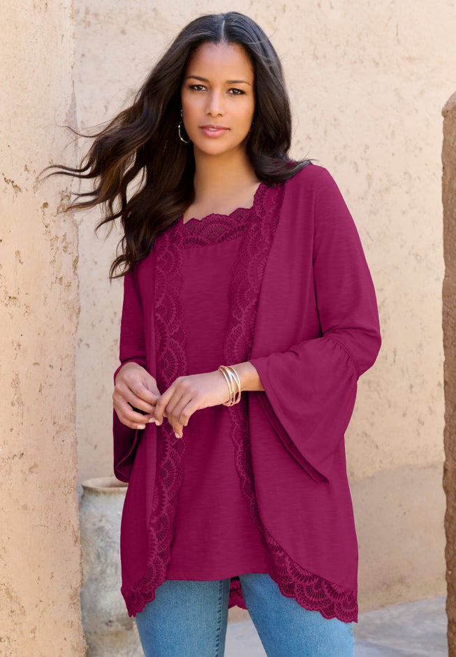 Double up on intricate and rich lace detail with this set. Lace trim lines both the open front and rounded hem of the cardigan and the square neck of the tank, offering alluring charm to your look. Bracelet-length bell sleeves on the outside layer add a final flourish. Banded straps and relaxed silhouette on the tank. It's incredibly versatile—wear the set together, style the tank alone or layer the cardigan over a sleeveless dress.