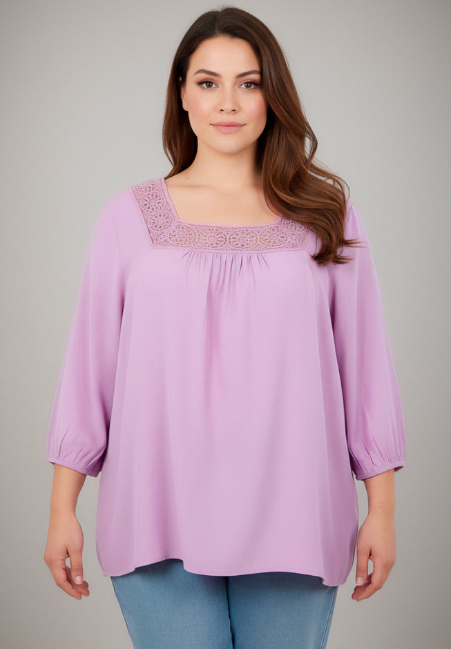 This airy peasant blouse features a square neckline accented with delicate lace trim for a soft, feminine look. Designed with gentle gathers and 3/4 sleeves finished with elastic cuffs, it offers an easy, comfortable fit with graceful movement. Lightweight and polished, it’s a versatile woven top that transitions effortlessly from casual days to dressed-up moments.