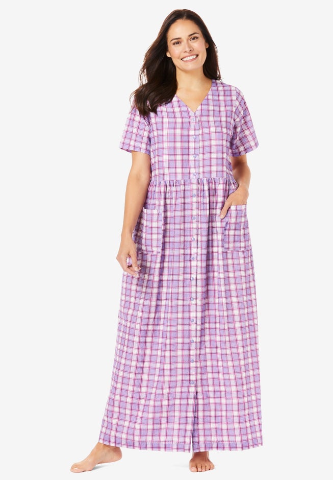 Made in lightweight seersucker fabric for warmer weather, this lounge dress looks great and keeps you cool. A snap-button front and shirred empire waist give the look of a casual dress that makes this perfect for wearing around the house.