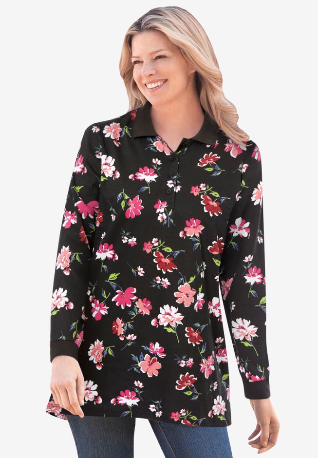 This roomy polo knit is a cute choice for relaxed comfort and breathable ease. Ribbed cuffs allow you to push the sleeves up for a casual look, or wear them down, and a four-button placket with collar stays in line with the classic polo look. Made in our most-loved tunic length.