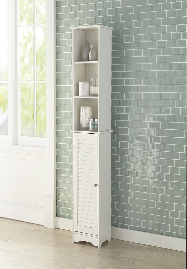 Stylish, space-saving bath coordinates add versatile storage to your space. Our tall cabinet features three open, adjustable shelves. Bottom door opens to three shelves.