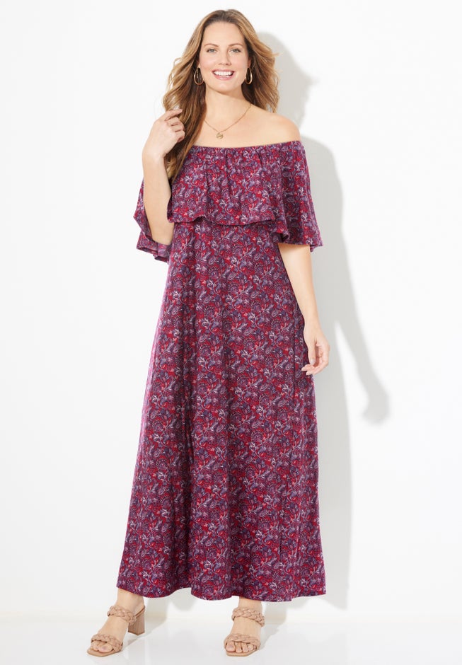 FIT: Everyone's favorite length for easy dressing and ultimate comfort, maxi dresses never fail to make a statement. Covered elastic at the neckline for styling on or off the shoulder. Flounce layer. Short sleeves. No closure, easy pull-over style.