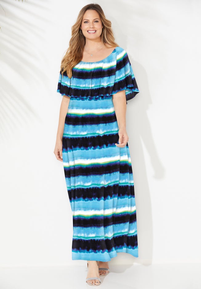 FIT: Everyone's favorite length for easy dressing and ultimate comfort, maxi dresses never fail to make a statement. Covered elastic at the neckline for styling on or off the shoulder. Flounce layer. Short sleeves. No closure, easy pull-over style.