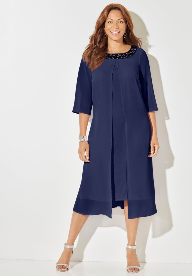 An intricate bead detail at the collar lends just enough sparkle to this timeless dress. Comfortable knit underlayer is topped with a chiffon overlay that parts elegantly at the front for a flyaway effect. This dress will bring effortless grace to your look, while keeping you comfortable all day or all night long.