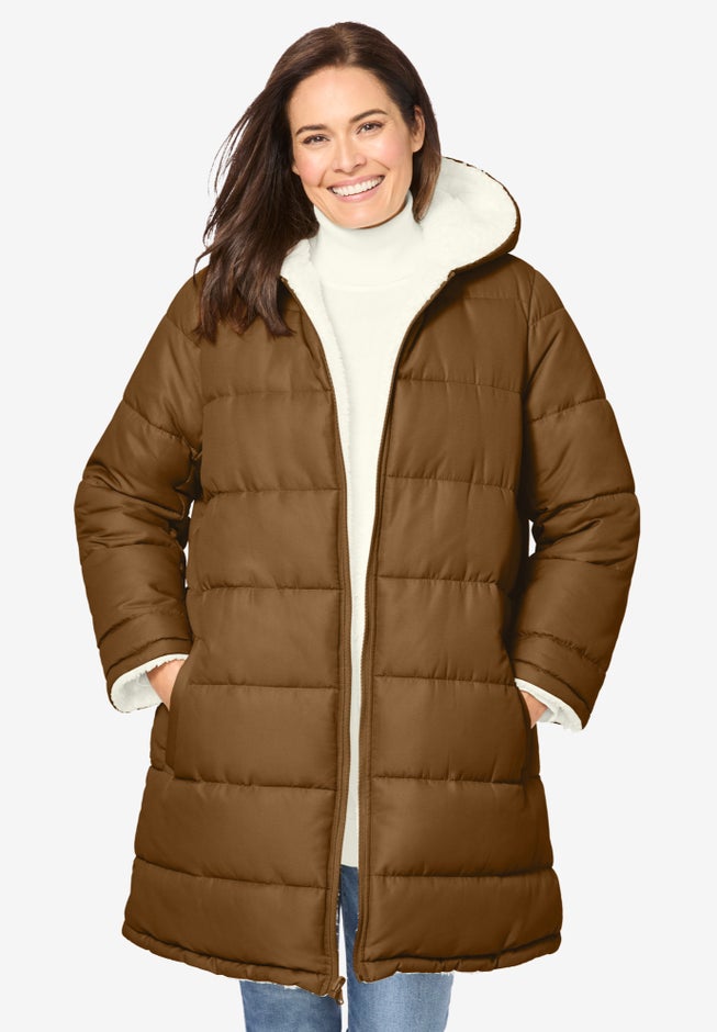 Our Reversible Puffer Coat has a microfiber side and a sherpa side. It's two great winter coats in one! Both sides have an easy zip front, cozy hood and roomy pockets.