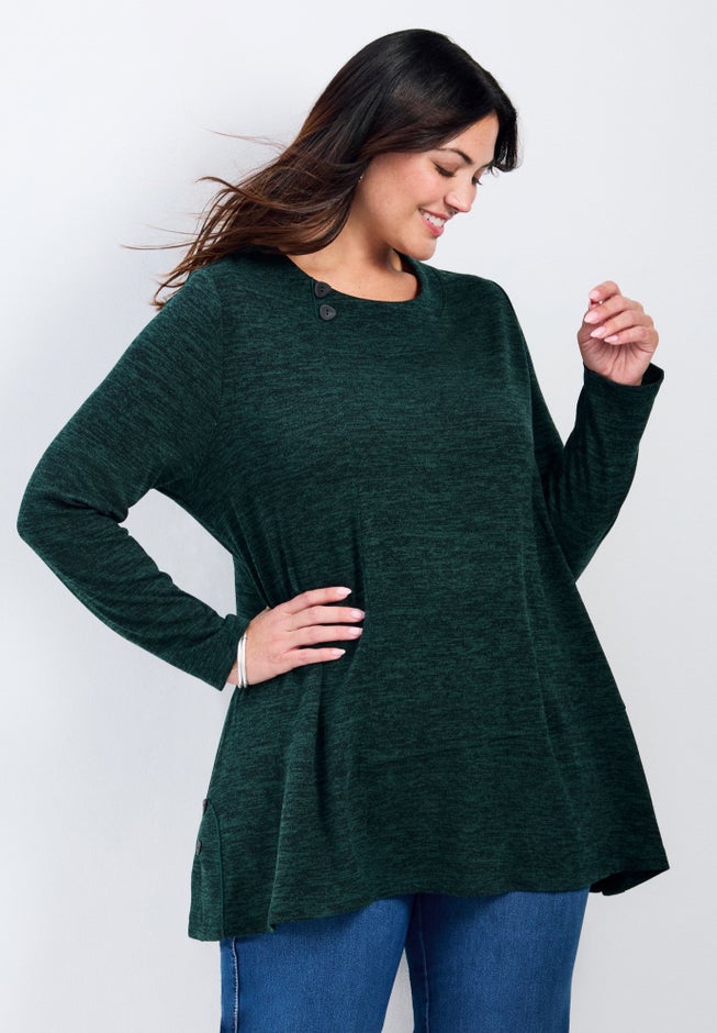 Wrap yourself up in the Ruby Hacci Button Top! This longline top, crafted from cozy hacci fabric, features a swing shape that dances with every step and stylish side splits adorned with buttons. Perfect for layering on those chilly days when you want both comfort and flair!