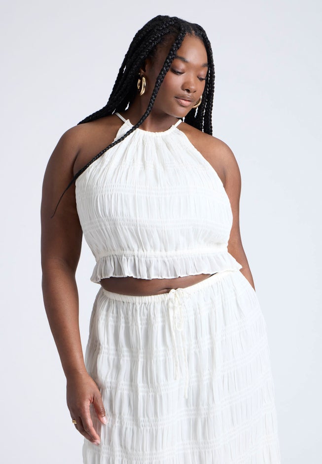 - Halter neckline with shirring