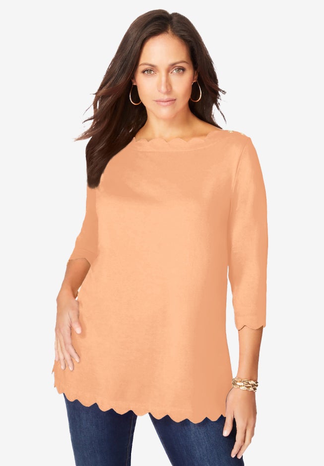 Meet the Jessica London women's plus size Scallop Boatneck Tunic: the timeless boatneck tunic you love, now reimagined with sophisticated scallop trim! Features a straight silhouette that eases over all your favorite bottoms and a flattering boat neckline. It's easy to dress up or down for any occasion!